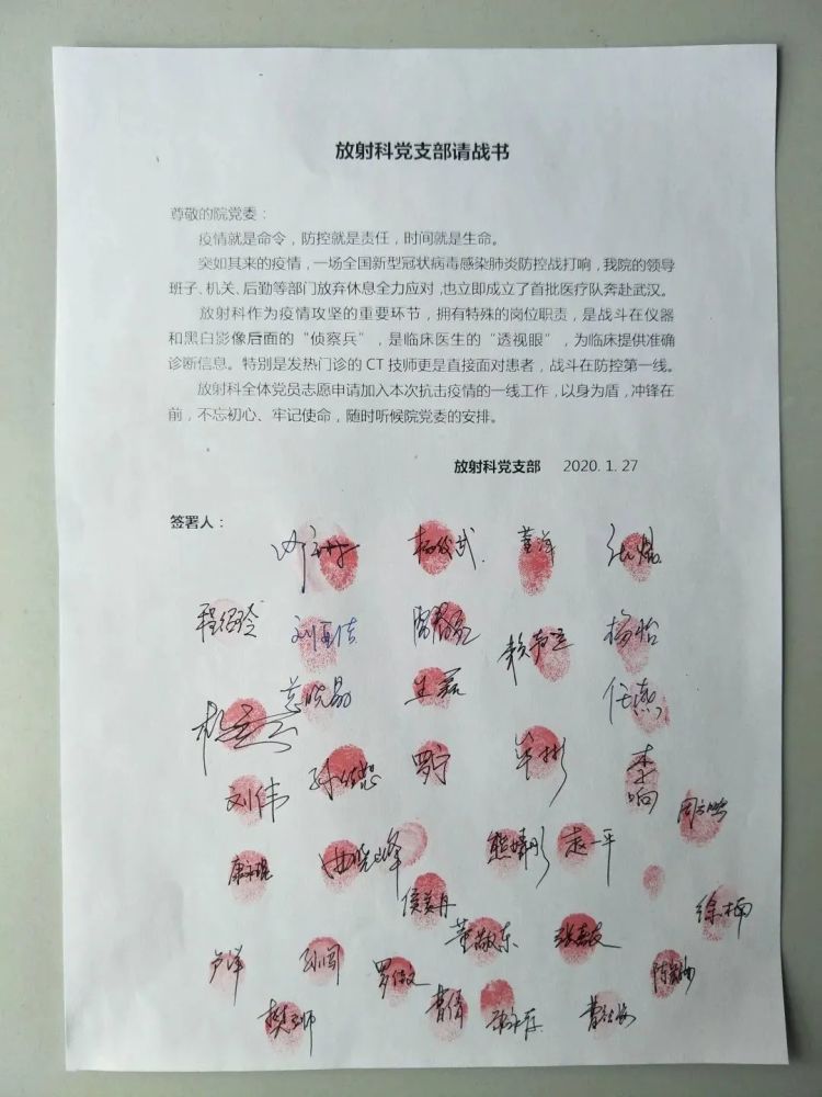 ▲2020年1月27日,沙琳所在放射科党支部党员签署抗疫请战书