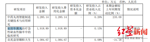 因此,安宫牛黄丸也成为同仁堂的当家王牌之一,据同仁堂2021年半年报,同仁堂“安宫牛黄丸传统制作技艺”列入第四批国家级非物质文化遗产代表性目录。2020年年报显示,同仁堂当期为安宫牛黄丸治疗急性缺血性脑卒中的临床研究投入研发金额近2000万元。