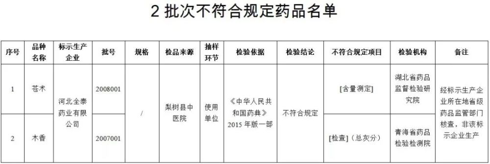 经湖北省药品监督检验研究院和青海省药品检验检测院检验,标示为河北全泰药业有限公司生产的1批次苍术和1批次木香不符合规定。现将相关情况通告如下: