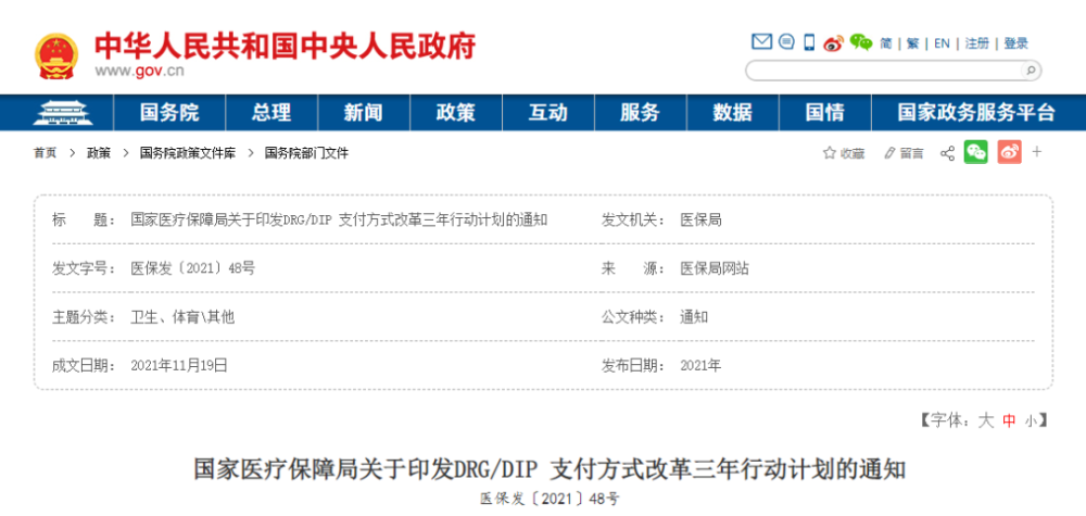 第三次是今年的11月底,国家医疗保障局《关于印发DRG/DIP 支付方式改革三年行动计划的通知》,以加快建立管用高效的医保支付机制为目标,分期分批加快推进,提出从2022到2024年,全面完成DRG/DIP付费方式改革任务,推动医保高质量发展。