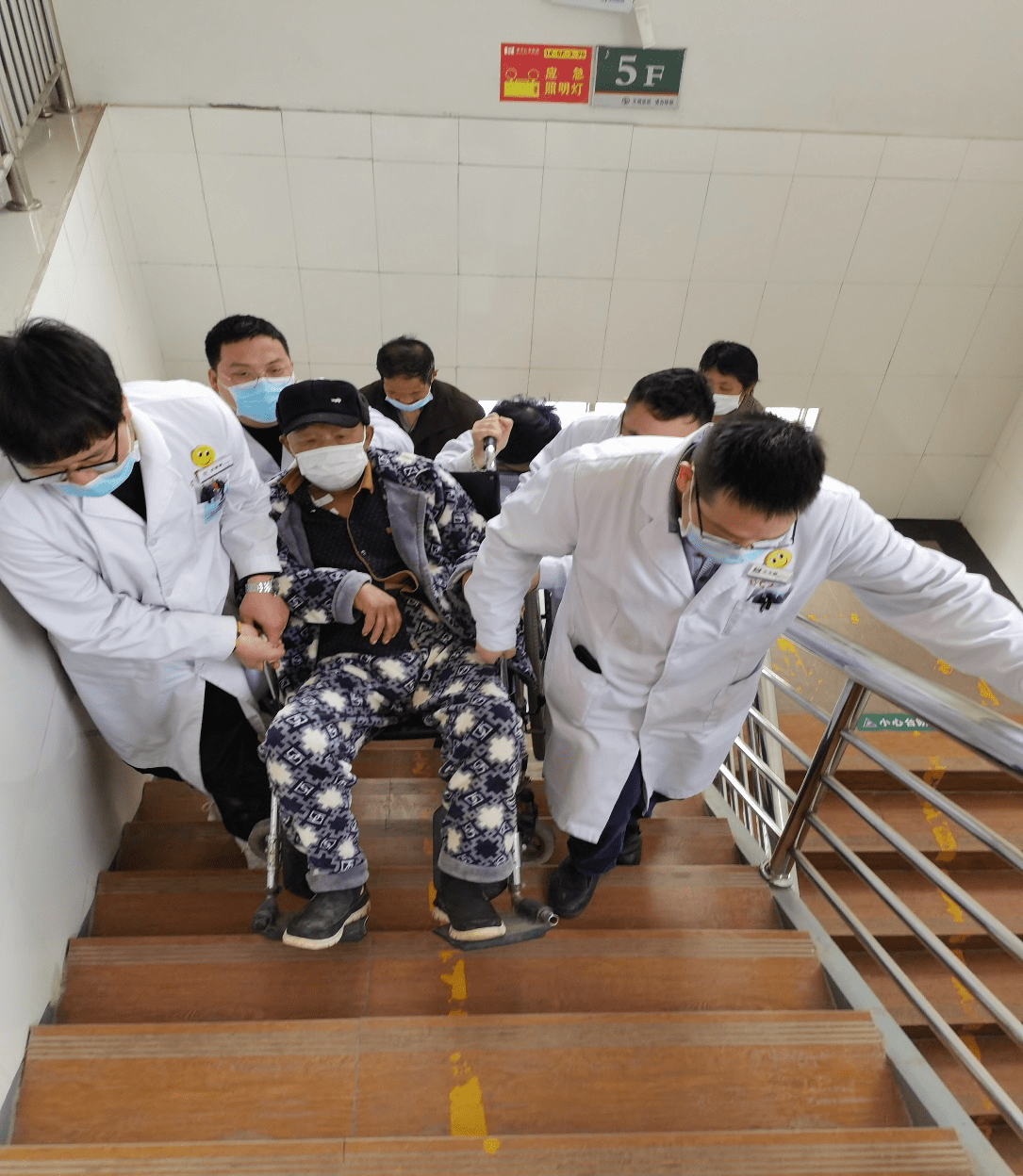 在透析室中也有一些行动不便需要帮助的肾友,在电梯故障时,为了不耽误他们透析,是王主任和科室李医生以及后勤科和心电图室彩超室的同事们不怕劳累,连同轮椅将他们从一楼抬到五楼,累的满头大汗却没有任何怨言,王主任甚至亲自将有的病人背到五楼。