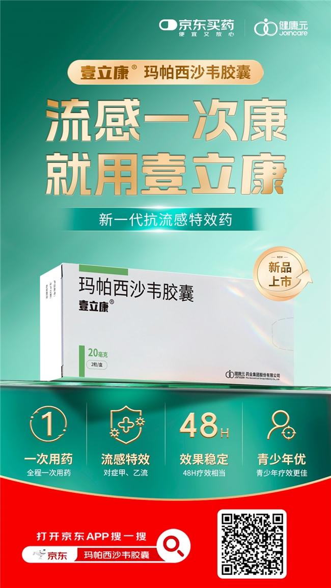12月31日,健康元药业集团旗下抗流感1类创新药——玛帕西沙韦胶囊(商品名:壹立康®)在京东健康平台线上首发。这是一款针对流感的创新型口服治疗药物,用户在京东APP搜索“壹立康”,即可便捷咨询购买,快速获取前沿抗流感病毒治疗方案。