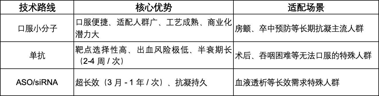FXI/FXIa抑制剂主要分为小分子、单抗、ASO/siRNA三类技术开发路线,各有定位,其中小分子类凭借临床进展快、商业化潜力大、适配人群广等优势,成为未来市场的主导方向。