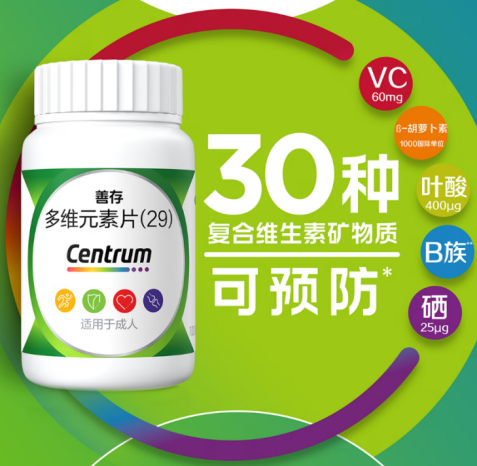 1、善存多维元素片(29):基于全球首个“复合维生素矿物质与急性上呼吸道感染”真实世界研究,历时3个月覆盖18个省份,3千多位真实居民参加,研究成果在亚太临床营养领域权威标杆学术期刊《亚太临床营养学》上重磅发布。它里面富含30种复合维生素矿物质,可显著降低中国人群感冒和流感的发生率达42.8%,对年龄≥45岁人群的效果更为突出。还能显著减少感冒和流感的鼻塞、喉咙痛、头痛、腹泻、打喷嚏、疲乏症状。多种维生素和矿物质协同作用,全面参与人体3道免疫防线。第一道防线加固生理屏障,第二道防线助力免疫细胞生长增殖,维持其生理功能,第三道防线参与T细胞增殖、活化,促进B细胞发挥功能。