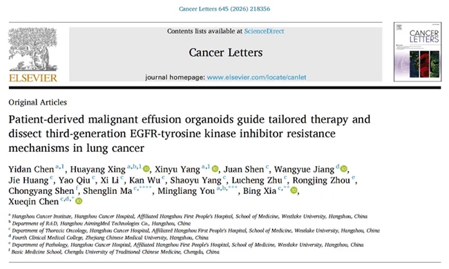 近日,艾名医学、西湖大学附属杭州市第一人民医院、杭州市肿瘤医院、成都中医药大学等团队经过3年联合攻关,首次成功利用肺癌晚期患者的恶性积液,建立患者来源类器官(下文简称PDO)模型,无需患者本人“试药”便可准确预测靶向药的用药效果,总体准确率达87.1%,为晚期肺癌精准治疗搭建了全新的技术平台。该成果也已发表在国际肿瘤学领域的顶尖期刊《Cancer Letters》(2026, 645:218356)上。