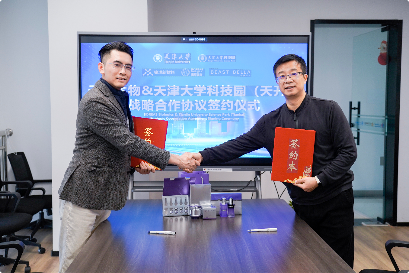 双方将整合各自核心优势,共同推进创新型生物材料、高新化学材料、新型渗透技术、水凝胶技术等在抗衰护肤领域的产业化应用,打造高功效、高安全性的护肤产品,建立配套工业化量产工艺与质量控制体系,实现科研成果从实验室到产业应用端的高效转化。北洋海棠基金发起合伙人、天津大学科技园总经理何勇军,天大科技园执行总裁郭晓丹,天津大学化工学院硕士导师,铭洋新材料(天津)有限公司总经理陈凯, 铭洋新材料(天津)有限公司项目经理温馨,云际生物执行董事张璐鸥,产品总监郭燕霞等出席了签约仪式。