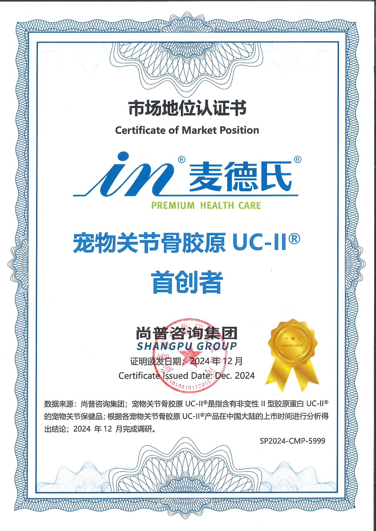 2024年,麦德氏获尚普咨询出具的“宠物关节骨胶原UC-II®首创者”认证证书,进一步印证了其在宠物关节护理领域的深耕成果与市场引领地位。