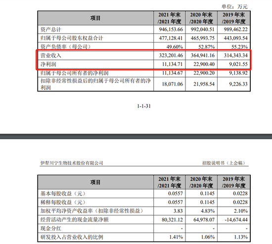 财务数据方面,2019-2021年报告期内,川宁生物分别实现营业收入31.43亿元、36.49亿元和32.32亿元,分别实现净利润9021.55万元、2.29亿元和1.11亿元。